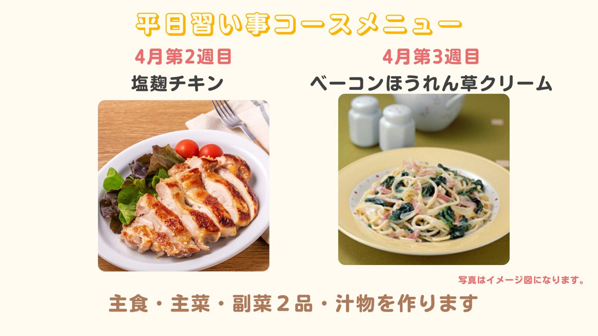 【お月謝】11,000円(月2回)6,000円(単発/体験)【menu】栄養満点の主菜、副菜2品、汁物を作ります
